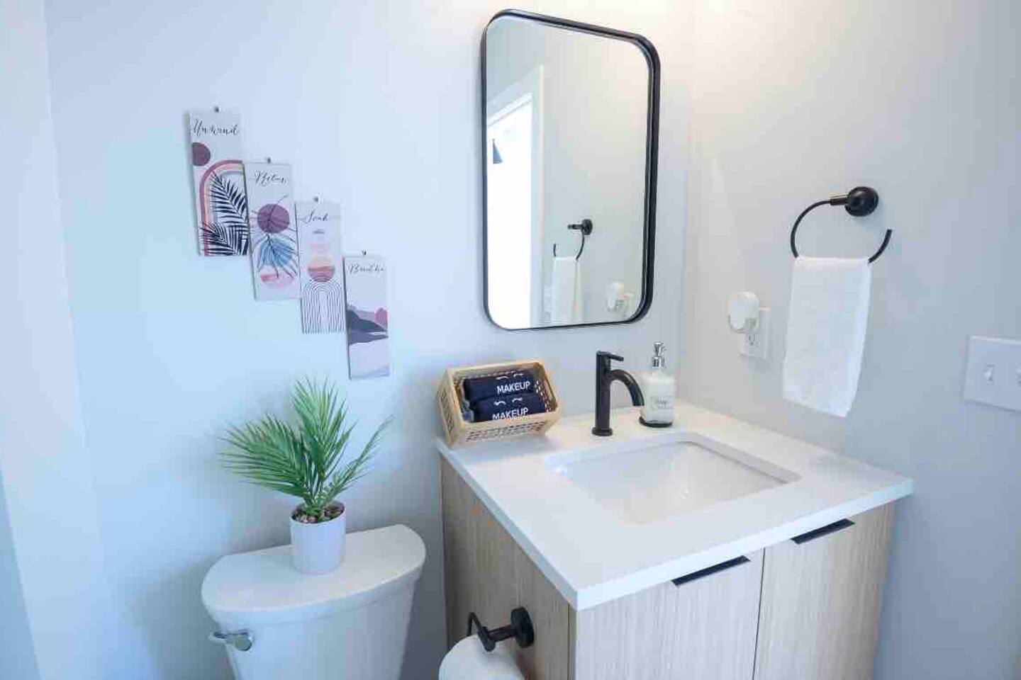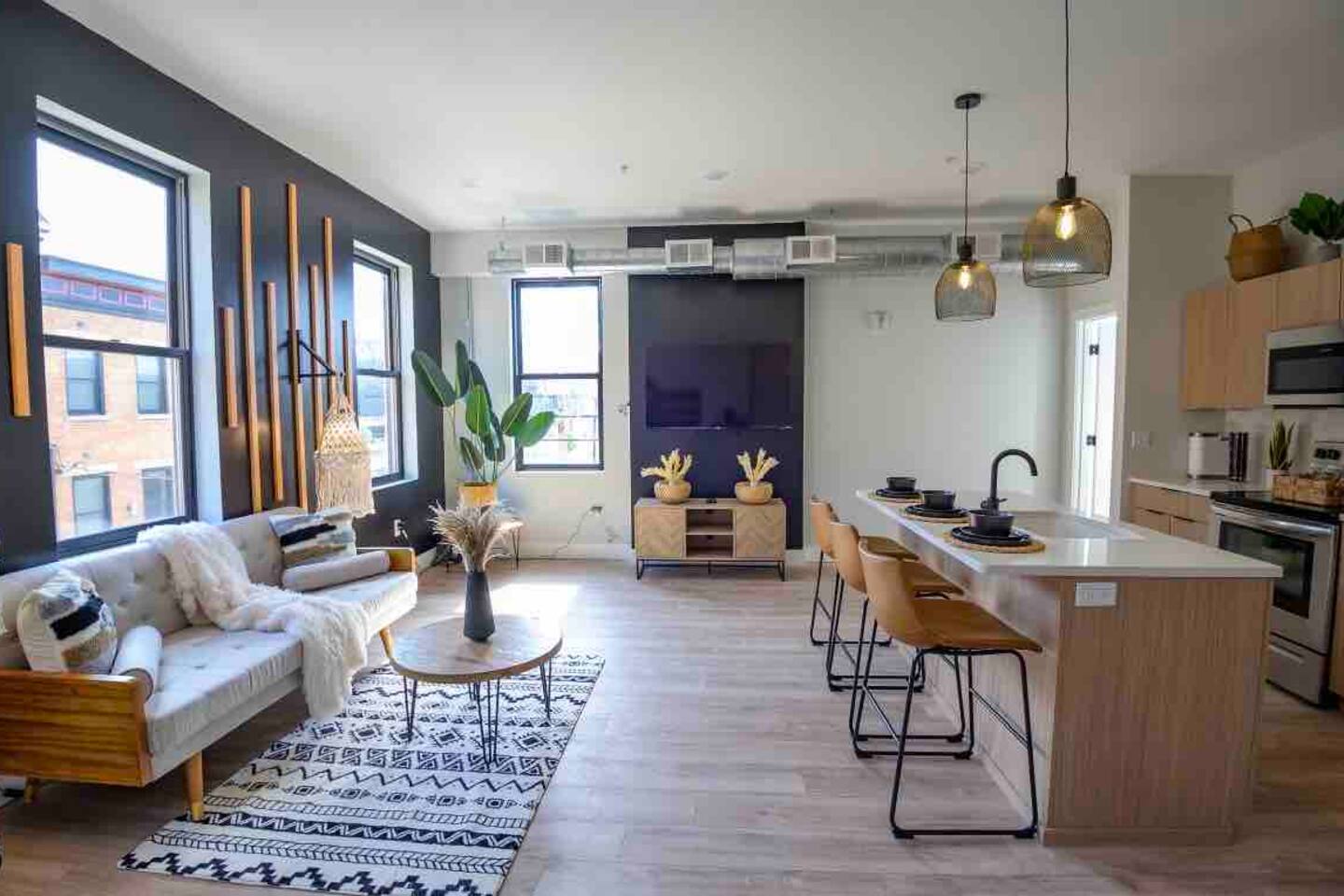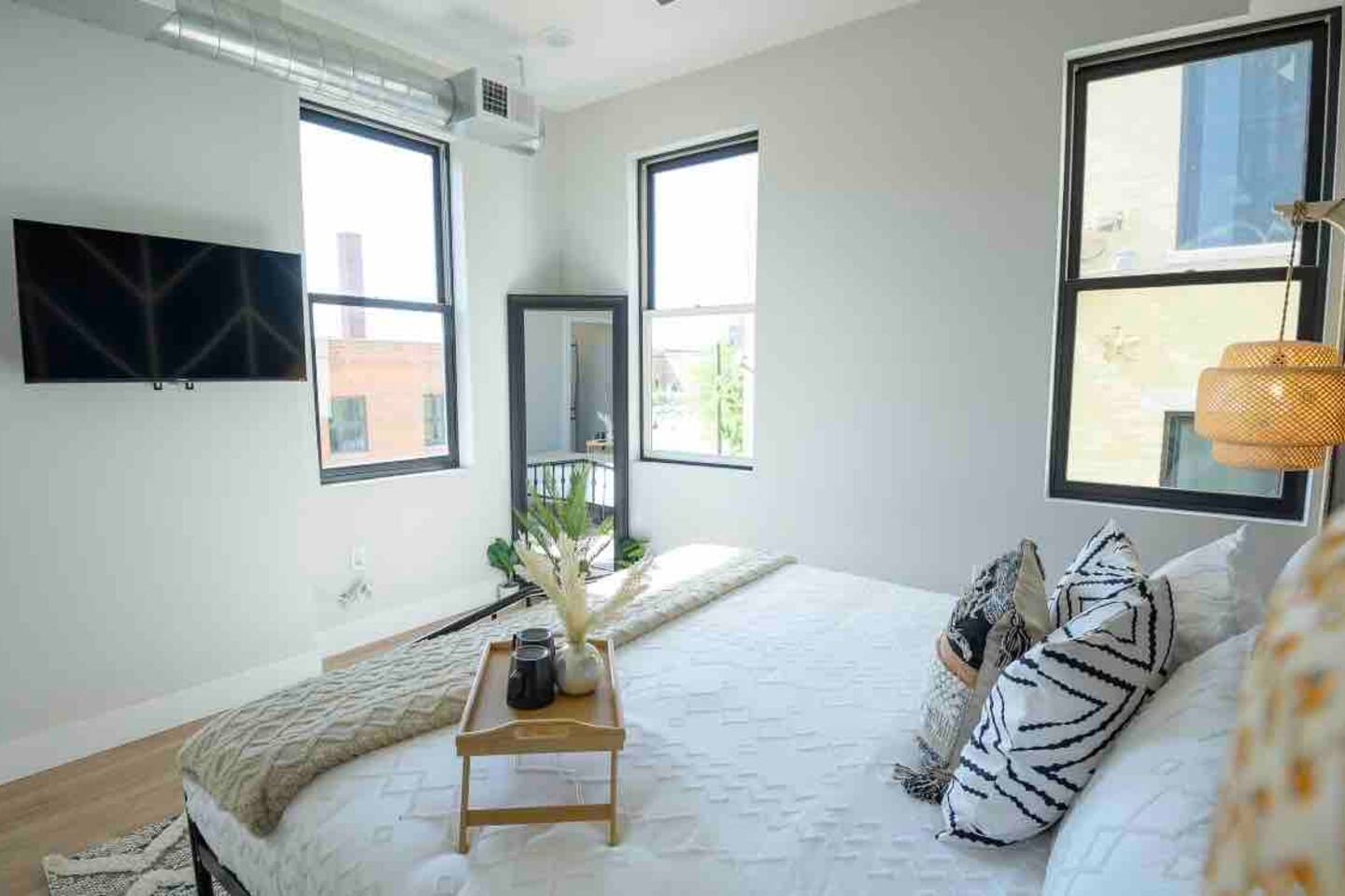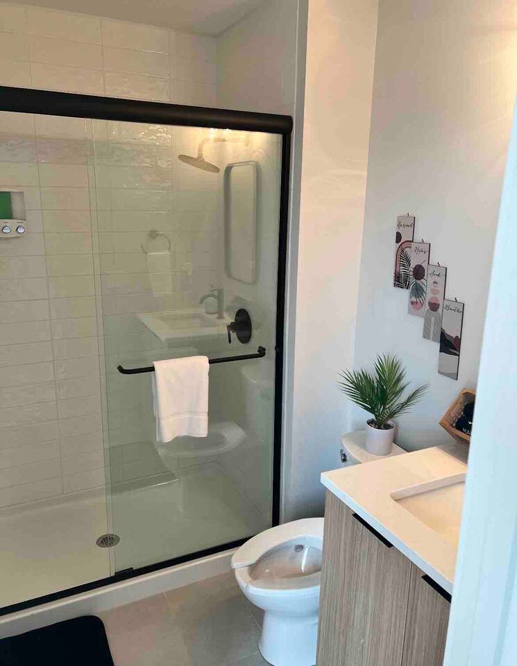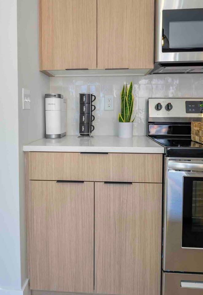 KEY FEATURES: ☀️ Brand new condo w/ open concept living area ☀️ 1 comfortable, spacious bedroom; 1 king ☀️ 1 full bathroom ☀️ High-speed wifi + 55in Roku Smart TV ☀️ In-unit washer + dryer ☀️ Full kitchen w/ stainless steel appliances + cooking necessities ☀️ Affordable + accessible parking LIVING ROOM * Open concept that comfortably seats 7 people * 3 seater sofa with accent pillows * Hanging lounge chair * Room-darkening wooden blinds KITCHEN * Granite countertops * Stainless steel appliances: electric stove, microwave, fridge, dishwasher * Keurig coffee machine * Complimentary assortment of coffees and teas * Toaster * Pots + pans + bakeware * Cutlery + silverware * Dishes, plates, drinking glasses, mugs * Dining seating at the island for three people BEDROOM * King sized bed * 3 large sunlit windows * Floor mirror * Room darkening wooden blinds BATHROOM * Spacious shower w/ rainfall shower head * Body wash, shampoo + conditioner * Makeup towels + bath towels * Hair dryer